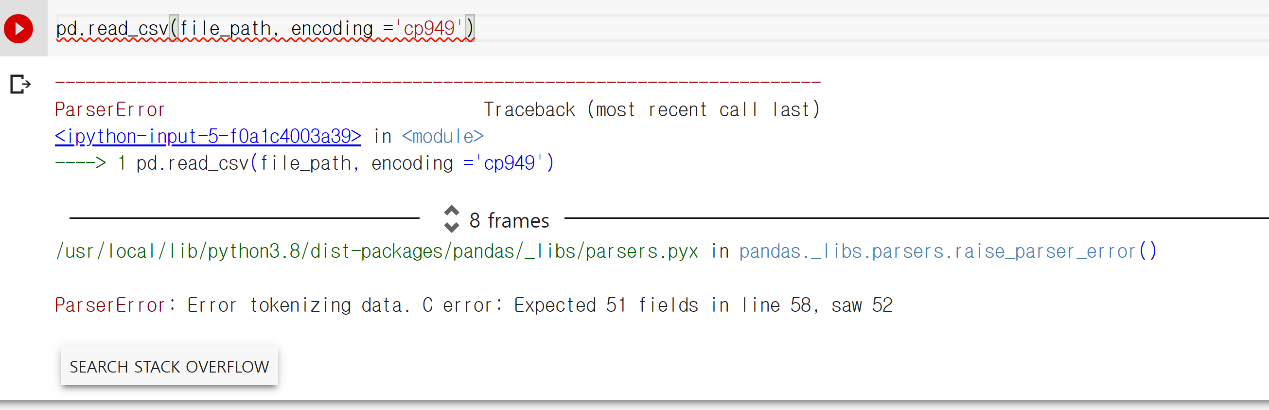 "ParserError: Error tokenizing data. C error: Expected 51 fields in line 58, saw 52"